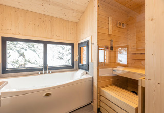 Den virkelige blikfang er det private wellnessområde i det store badeværelse. Nyd et afslappende bad i spabadet, varm dig op i den lille sauna (til 1–2 personer) og kig ud over bjerglandskabet. Det er det ideelle sted at slappe af, snakke og lade op efter skiløb, vandreture eller cykling.