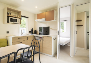 I hjertet af lodgen finder du en varm, moderne stue med et komfortabelt siddeområde og et spisebord. Den går direkte over i et fuldt udstyret, åbent køkken med både køle-fryseskab, mikrobølgeovn og en Senseo-kaffemaskine, så du kan få en god start på morgenen.