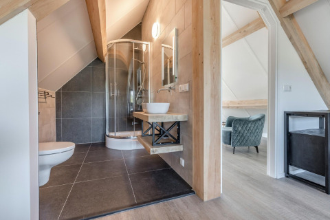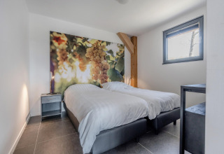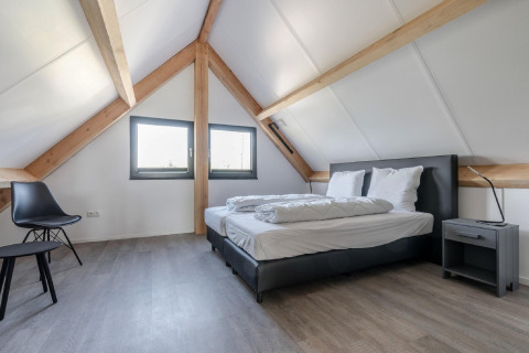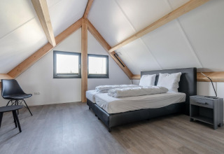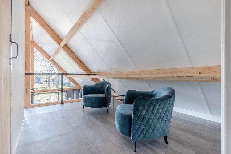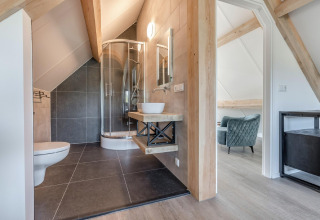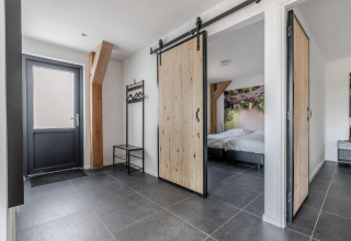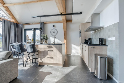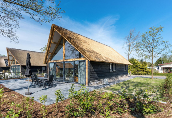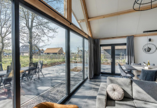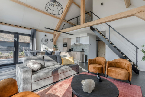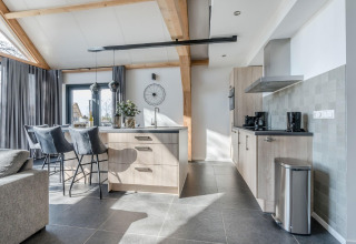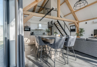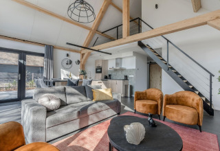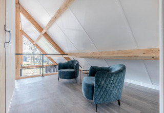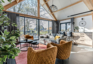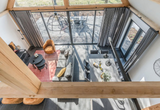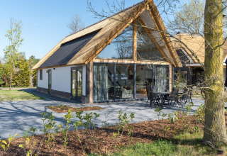 Parc de Kievit 19 er et stilfuldt feriehus, der er perfekt til en gruppe venner, som ønsker et afslappende ophold. Den varme blanding af træ, sten, glas og stråtag giver huset en hyggelig, eksklusiv stemning. Når du træder ind, vil du straks bemærke den imponerende loftshøjde i stuen. Takket være den næsten helt glasbeklædte facade får du masser af naturligt lys og en fantastisk udsigt til haven.