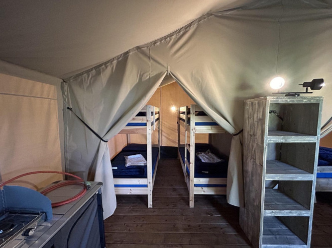 Bergerven Lodge 6 er et glampingtelt med plads til 6 personer. Gå tilbage til naturen og oplev campingfølelsen, men med luksusen af et møbleret telt! Glampingteltet har to soveværelser, et med to køjesenge og et med en dobbeltseng. Der er også et tekøkken med elkedel og filterkaffemaskine og masser af opbevaringsplads til alle dine ejendele. Du kan nyde middagen i teltet eller udenfor på din egen terrasse ved havesættet. Der er ingen sanitære faciliteter i glampingteltet, men du kan bruge toiletblokken på ferieparken. Du kan bruge gratis Wi-Fi i glampingteltet.