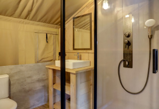 Dette smagfuldt indrettede safaritelt har et opholdsareal på ca. 25 kvadratmeter og en dejlig rummelig terrasse med markise.