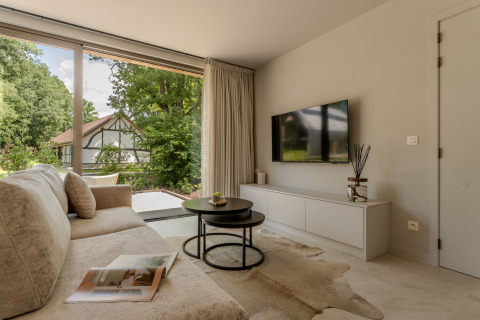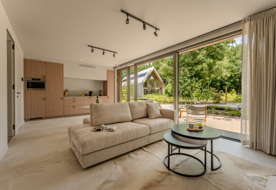 Suiten er ideel til en romantisk weekendtur eller et hyggeligt ophold for to. Lodgen har et smagfuldt indrettet soveværelse med en kingsize-seng, som altid er redt op til dig. Det moderne badeværelse er udstyret med en dobbelt håndvask, en rummelig bruser og alle de nødvendige håndklæder. Det åbne køkken er udstyret med alle bekvemmeligheder såsom en Nespresso-kaffemaskine, en kombineret mikrobølgeovn og en opvaskemaskine, så du nemt kan tilberede et lækkert måltid. Fra stuen er der udgang til en solrig terrasse med havemøbler, som er perfekt til at nyde eftermiddagssolen.