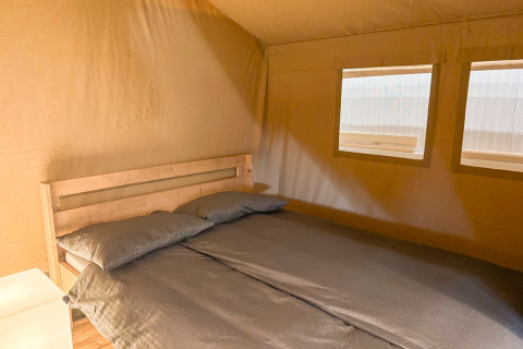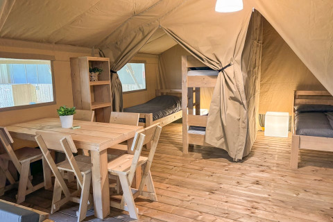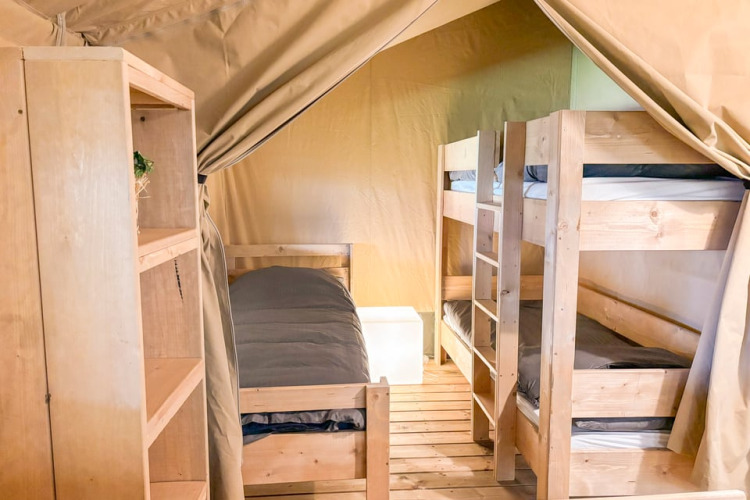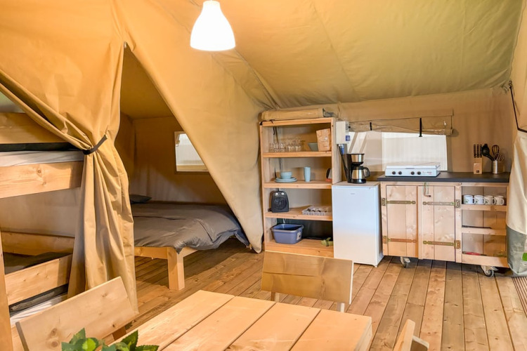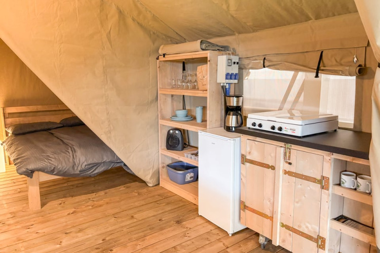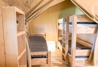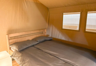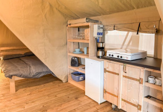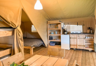 Dette unikke safaritelt er udstyret med alt, hvad du behøver for den perfekte glampingferie! Teltet har en hyggelig veranda med markise, så du kan nyde udelivet. Det har et fuldt udstyret lille køkken med inventar og et fireblusset sikkert gaskomfur, der kan flyttes udenfor. Perfekt til udendørs madlavning! Der er også et køleskab, en kaffemaskine og en elkedel. Derudover har safariteltet to soveafdelinger. I den ene er der en dobbeltseng (160x200cm), og i den anden er der en enkeltseng og en køjeseng. Alle senge er inklusiv dyner og puder.