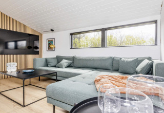 Det lyse, moderne opholdsrum samler køkken, spiseplads og stue i ét indbydende rum. Lav mad sammen i det fuldt udstyrede køkken med keramisk kogeplade, ovn med grill, mikrobølgeovn, opvaskemaskine og kaffemaskine, og sæt dig derefter til rette i de komfortable sofaer med en film på Smart TV'et. Takket være lynhurtigt WiFi og indbyggede streaming-apps kan du nemt logge ind på dine egne streamingtjenester.