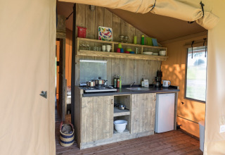 Safariteltet har elektricitet og kombinerer luksus med den eventyrlige fornemmelse af camping. En perfekt base for en uforglemmelig ferie!