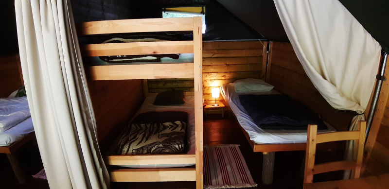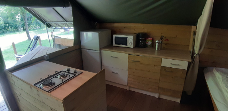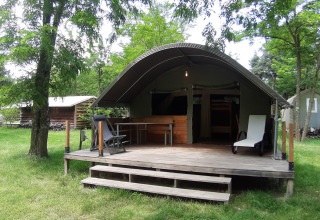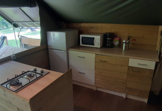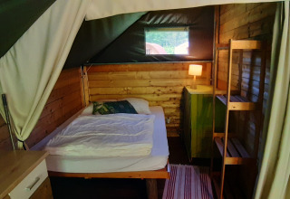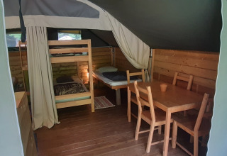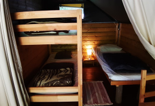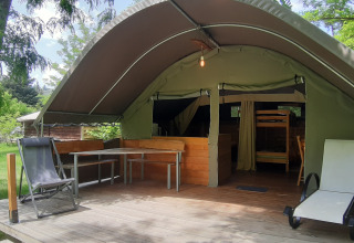 Kibo tenten kombinerer komfort med stort fokus på natur og enkelhed. Boligen ligger på en solrig, græsrig plads på 150 m², tæt ved floden og sandstranden, med udsigt til de omkringliggende bjerge. Teltet har et indendørsareal på 24 m² og en stor træterrasse på 16 m², som nås via en lille trappe. Indenfor finder du to separate soveværelser: ét med en dobbeltseng, og ét med en enkeltseng plus en køjeseng. Det udstyrede køkken har køleskab/fryser, mikrobølgeovn, to-blus kogeplade, kaffemaskine og fuldt service. Teltet har elektricitet, men ikke eget badeværelse; du benytter campingpladsens sanitære faciliteter. Udendørs kan du nyde en halvt overdækket terrasse med havemøbler, liggestol og parasol.