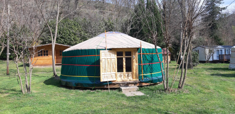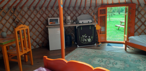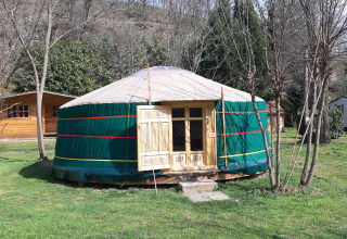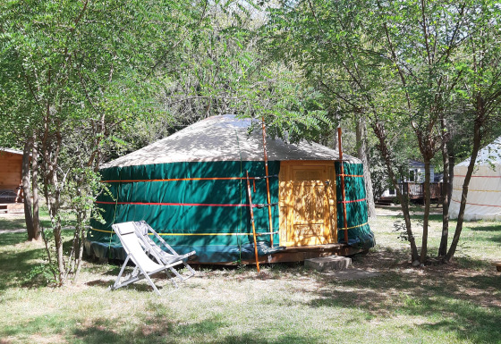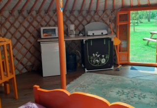 Joert-teltet tilbyder en særlig måde at campere på i harmoni med naturen. Denne traditionelle mongolske boligform passer smukt ind i det rolige landskab i den Grønne Ardèche, direkte ved floden. Det runde telt har et opholdsrum på 27 m² og giver plads til fire personer. Indenfor finder du en dobbeltseng, to enkeltsenge og en stemningsfuldt indrettet stue med køkken. Køkkenet er fuldt udstyret med køleskab, mikrobølgeovn, to-blus komfur, kaffemaskine og service.