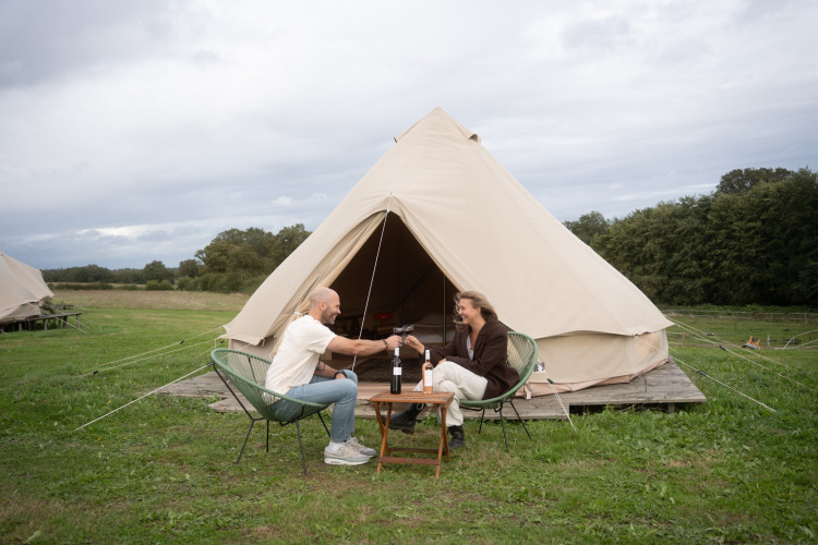 Pak let, for alt er klar: sengetøj, service, pande, køleskab, kaffemaskine, elkedel og to-blus komfur. Vil du hellere lave mad udenfor? Tænd op i grillen. Om dagen udforsker du området, om aftenen stirrer du endeløst op på stjernerne og trækker dig tilbage bag skillevæggen for en stille nat. Dit private badeværelse med kemisk toilet står lige ved siden af teltet; bruseren finder du i sanitetsbygningen. Sådan skal camping føles—fri, komfortabel og midt i det grønne.