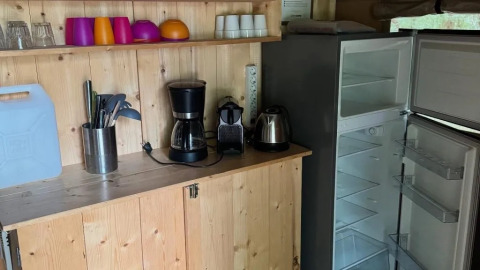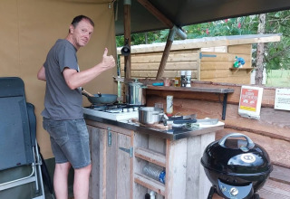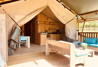 Dette robuste safaritelt står på en træplatform og tilbyder en komfortabel glampingoplevelse midt på campingpladsen. Indenfor finder du en rummelig opholdsstue med spisebord og bænke samt to soveområder. Forældrene sover på komfortable boxmadraser, og i det andet soveområde er der to køjesenge. Hovedpuder, dyner og sengelinned er inkluderet. I teltet er et tekøkken med omfattende inventar, et stort køleskab med fryser og en Nespresso-maskine. Til madlavning er der et mobilt udekøkken med et gaskomfur med 4 blus.