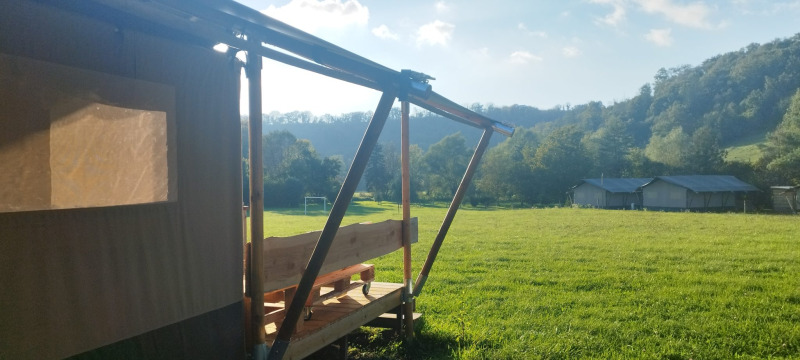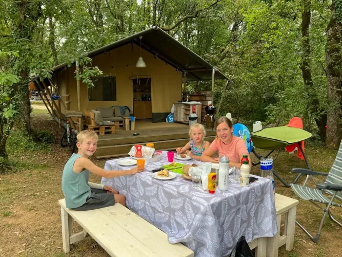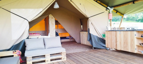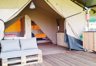 På verandaen kan du slappe af på to loungbænke eller i hængekøjen. På pladsen står desuden et træbord med bænke og to justerbare campingstole. Der er også en gasgrill til rådighed. Teltet har ikke eget badeværelse; du benytter campingpladsens sanitære faciliteter. Takket være den rummelige veranda og udendørsfaciliteter er udelivet i centrum her.