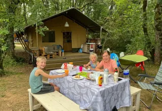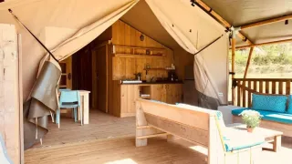 Denne robuste safaritelt står på en træplatform og tilbyder en komfortabel glampingoplevelse midt på campingpladsen. Indenfor finder du et rummeligt opholdsrum med spisebord og bænke samt to soveafdelinger. Forældrene sover på komfortable boxmadrasser, og i det andet soveområde er der to køjesenge. Hovedpuder, dyner og sengetøj er inkluderet. I teltet er der et lille køkken med omfattende inventar, et stort køleskab med fryser og en Nespresso-maskine. Til madlavning er der et flytbart udekøkken med en 4-blus gaskogeplade.