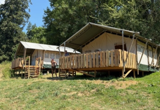 Oplev den ultimative glampingfølelse i denne safaritent til 4 personer i Saône-et-Loire, Bourgogne-Franche-Comté. Teltet på cirka 37,5 m² kombinerer trædetaljer og en oplukkelig front, der giver direkte forbindelse til naturen. To soveværelser giver plads til tre senge: en dobbeltseng og to enkeltsenge, alle udstyret med tæpper og puder. Udenfor venter en overdækket veranda med markise, ideel til afslapning eller middage. Det fuldt udstyrede køkken indeholder et fireblusset gaskomfur, som kan flyttes udenfor, et køleskab, kaffemaskine og elkedel — perfekt til madlavning i det fri. Kæledyr er velkomne, rygning er ikke tilladt. Nyd en komfortabel ferie midt i naturen, hvor afslapning og bekvemmelighed går hånd i hånd.