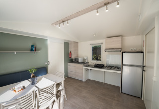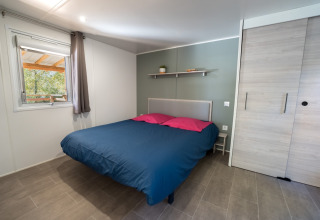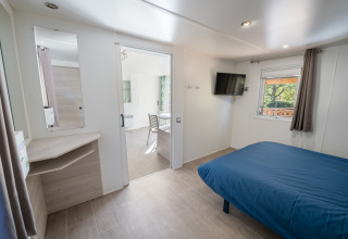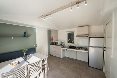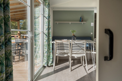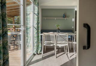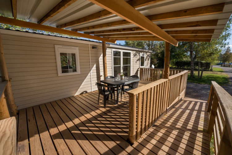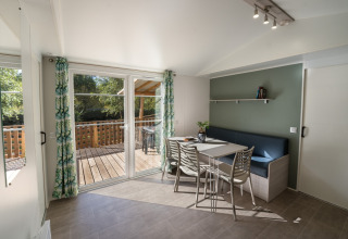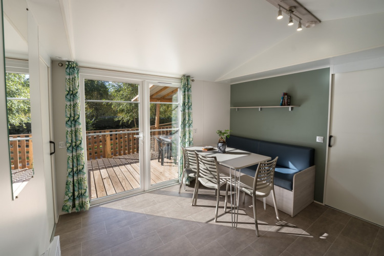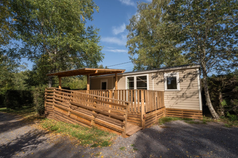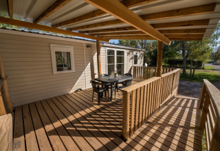 Comfort Mobil-home på 35m², tilgængelig for personer med nedsat mobilitet, med en delvist overdækket terrasse, rummelig og tilpasset, bestående af: