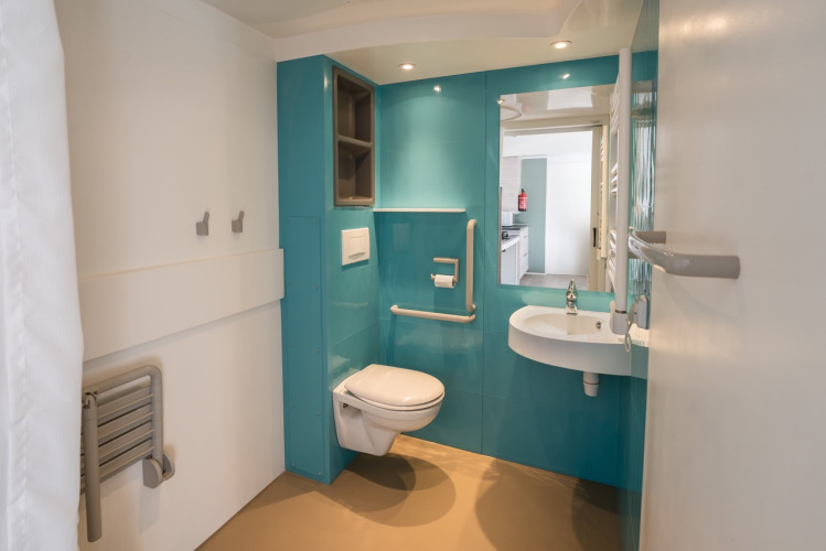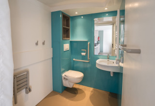 Badeværelse: toilet, bruser og håndvask, tilgængelig for personer med nedsat mobilitet