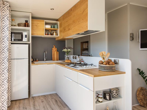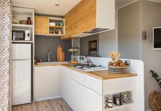 Det åbne amerikanske køkken ligger i stuen og er fuldt udstyret. Der er et køleskab med fryser, opvaskemaskine, komfur, mikrobølgeovn og emhætte. Også til stede: en Nespresso-kaffemaskine, elkedel, brødrister, citruspresse og trykkoger. Service er tilpasset antallet af personer.