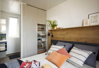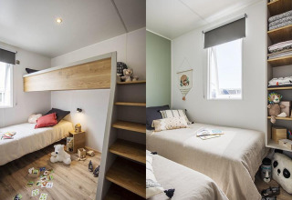 Boligen har tre separate soveværelser. Det første soveværelse har en dobbeltseng på 160 x 200 og skabsplads. Det andet soveværelse har to enkeltsenge på 80 x 190 og skabsplads. Det tredje soveværelse har en tværstillet køjeseng med to enkeltsenge på 80 x 190 og skabsplads. Alle soveværelser har skodder.