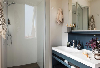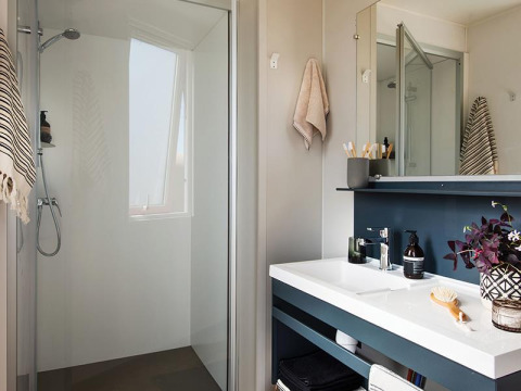 Der er to badeværelser med bruser, håndvask, håndklædetørrer og hårtørrer. Boligen har to toiletter, hvoraf det ene er separat. Aircondition sørger for køling og opvarmning. Et fjernsyn er til rådighed.
