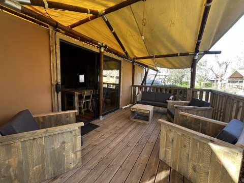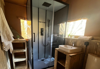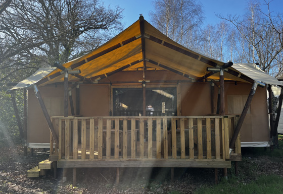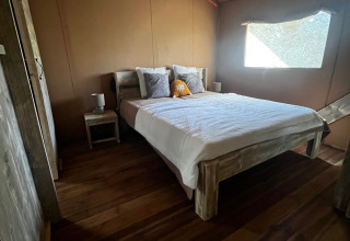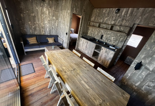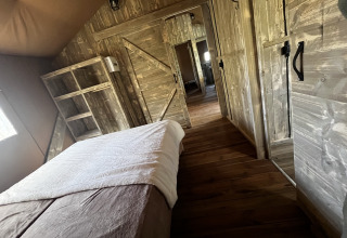 Luxury Lodge XXL tilbyder en komfortabel opholdsoplevelse for familier eller vennegrupper på seks personer. Lodgen på 40 m² ligger roligt i skoven på et skyggefuldt sted og har udsigt over landskabet. Indenfor er der to soveværelser, det ene med en dobbeltseng og det andet med en køjeseng. I stuen er der en sovesofa, der giver ekstra plads til to personer.