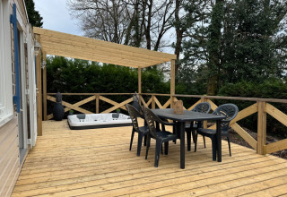 Mobilhome Premium Spa er en komfortabel og bæredygtig bolig til fire personer. Mobilhomet ligger på et skyggefuldt sted i en rolig del af campingpladsen og har udsigt over det omkringliggende landskab. Boligen er røgfri, og parkering er muligt direkte ved boligen.