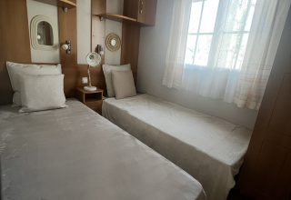 Mobilhomet har to soveværelser. Det ene soveværelse har en dobbeltseng og direkte adgang til terrassen og den private jacuzzi. Det andet soveværelse har to enkeltsenge. Der er et badeværelse med bruser, håndvask og vaskemaskine. Toilettet er separat. I stuen er der aircondition til både køling og opvarmning.