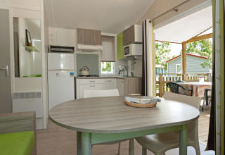 Den har en stor, delvist overdækket træterrasse med havemøbler, ideel til at spise udendørs. Køkkenet er udstyret med et 4-blus gaskomfur, et stort køleskab med fryser, en mikrobølgeovn, en kaffemaskine og alt nødvendigt køkkenudstyr.