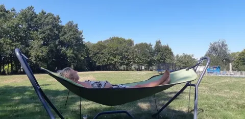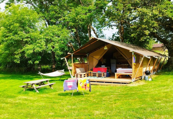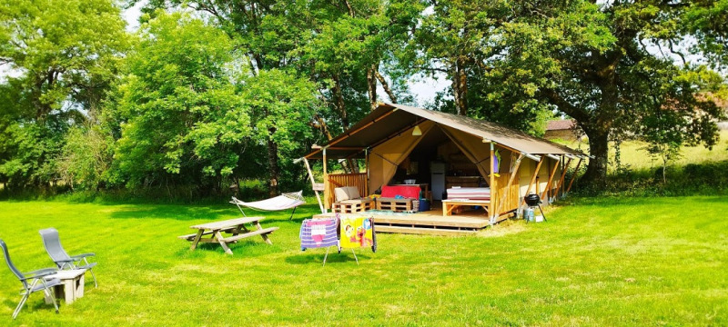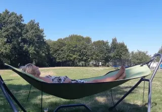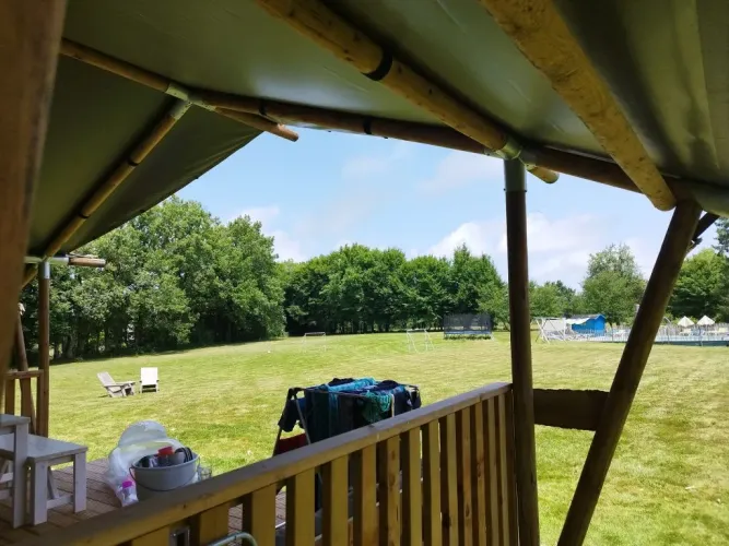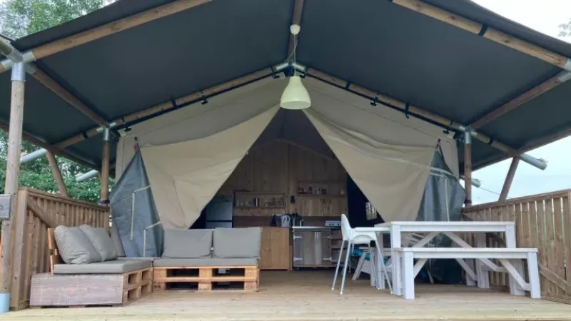 På verandaen kan du slappe af på to loungesofaer eller i hængekøjen. På campingpladsen er der desuden et træspisebord med bænke og to justerbare campingstole. Der er også en gasgrill til rådighed. Teltet har ikke eget badeværelse; du benytter campingpladsens sanitære faciliteter. Takket være den rummelige veranda og udendørs faciliteter er udelivet centralt her.