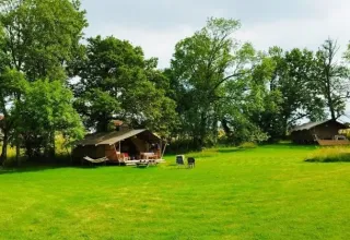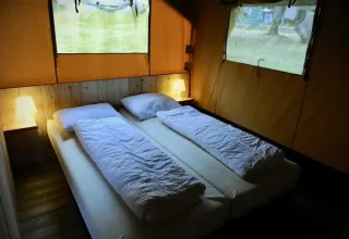 Dette robuste safaritelt står på en træterrasse på 35m2 og tilbyder en komfortabel glampingoplevelse midt på campingpladsen. Indenfor finder du et rummeligt opholdsområde med spisebord og bænke samt to soveafdelinger. Forældrene sover på komfortable boxmadrasser, og i det andet soveområde står der en køjeseng og en enkeltseng. Hovedpuder, dyner og sengelinned er inkluderet. I teltet står et tekøkken med et omfattende inventar, et stort køleskab med fryser og en Nespresso-maskine. Til madlavning er der et flytbart udekøkken med et gaskomfur med 4 blus. Der er også en vandpost i dette telt.