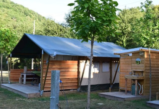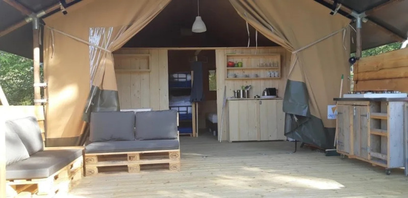 Dette robuste safaritelt står på en træterrasse og tilbyder en komfortabel glampingoplevelse midt på campingpladsen. Indenfor finder du en rummelig opholdsstue med spisebord og bænke samt to soveområder. Forældrene sover på komfortable boxmadras-senge, og i det andet soveområde er der to køjesenge. Hovedpuder, dyner og linned er inkluderet. I teltet er der et tekøkken med omfattende inventar, et stort køleskab med fryser og en Nespresso-maskine. Til madlavningen er der et flytbart udekøkken med et 4-blus gaskomfur.