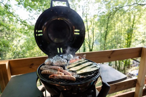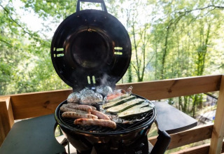 På verandaen kan du slappe af på to loungesofaer eller i hængekøjen. På campingpladsen står desuden et træspisebord med bænke og to justerbare campingstole. Der er også en gasgrill til rådighed. Takket være den rummelige veranda og udendørsfaciliteter er udelivet i centrum her.