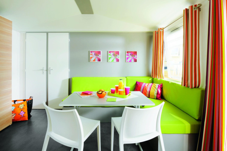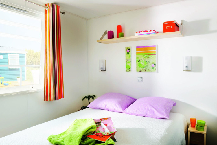 Stacaravan Comfort TV med 2 soveværelser har tv og tilbyder en moderne opholdsstue: 1 opholdsstue med fuldt udstyret køkken (komplet servise, gaskogeplade, mikrobølgeovn, køle-fryseskab, filterkaffemaskine) samt en spiseplads med bord, stole og en sovesofa (afhængig af modellen) 1 soveværelse med en dobbeltseng 140×190 cm 1 soveværelse med 2 enkeltsenge 80×190 cm 1 badeværelse med bruser og håndvask Separat toilet