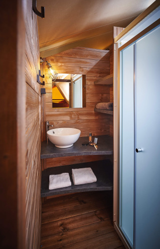Oplev udendørslivet med hjemmets komfort i denne rummelige Cabane Lodge på pæle. Med 46 m² indendørs og en overdækket terrasse på 10 m² er dette det ideelle sted for en afslappende ferie i luksus.