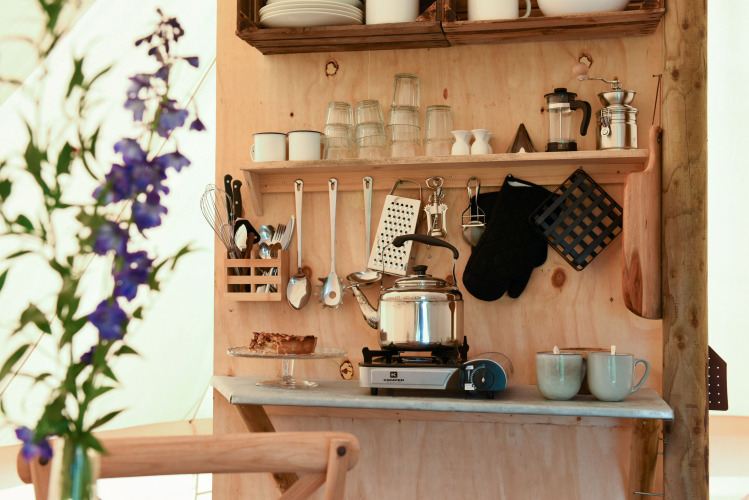 Smûk Grutte Bell teltet er et smukt tilflugtssted for fire personer, omhyggeligt indrettet med naturlige materialer og beliggende på en rummelig, afsidesliggende plads med udsigt over markerne. Indretningen byder på komfortable senge med rigtige madrasser, hvilket sikrer en god nattesøvn. Udenfor teltet finder du en privat terrasse med et picnicbord og 2 strandstole, en udendørs madlavningsmulighed – perfekt til måltider i det fri – og et opvaskested med koldt rindende drikkevand. Du må også gerne benytte det fælles udekøkken. Teltet er desuden udstyret med en køleboks og en lille lampe, som bidrager til en hyggelig og komfortabel atmosfære. Denne unikke indkvartering, omgivet af smuk beplantning, tilbyder masser af privatliv og er det ideelle sted at slappe af og nyde naturen.