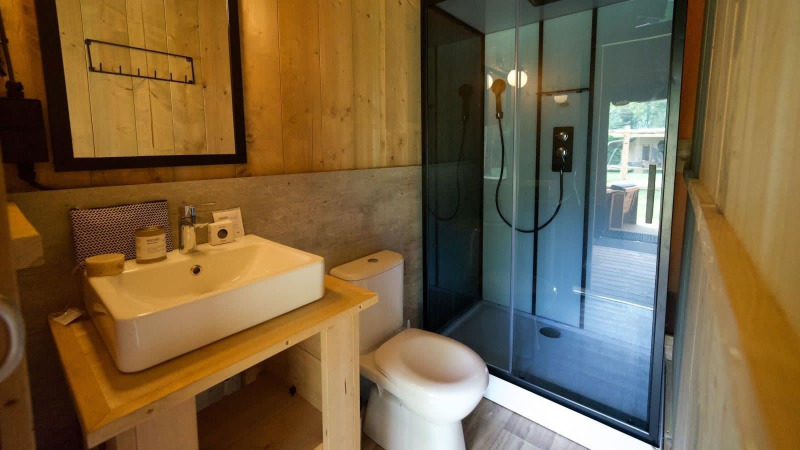 Glampingteltet Desert 5 er et fuldt udstyret glampingtelt. Det er i jordhøjde, har plads til 5 personer og kan nås via et par trin. Opholdsrummet har et åbent køkken og er udstyret med bl.a. induktionskogeplade og køleskab. Der er også en hyggelig spiseplads med fjernsyn. Teltet har 2 soveafdelinger med 5 sengepladser: 1 dobbeltseng og 1 køjeseng med 3 enkeltsenge. I badeværelset er der toilet, håndvask og brusekabine. Den overdækkede terrasse er udstyret med havemøbler. Ved Glampingtent Desert 5 kan du parkere 1 bil, og du kan bruge Wi-Fi.