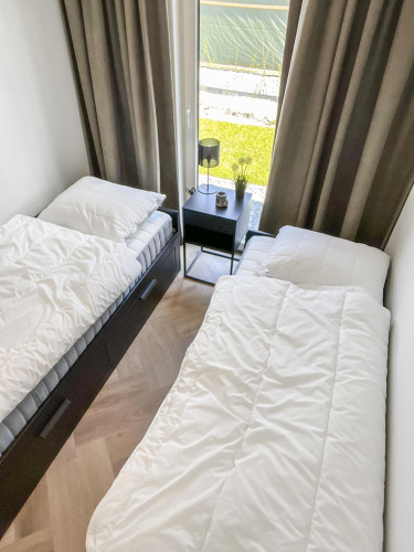 Vågn op forfrisket om morgenen og nyd et varmt brusebad med rene håndklæder til din rådighed. For ekstra bekvemmelighed er der rummelige garderobeskabe i soveværelset, så du kan opbevare dit tøj pænt.