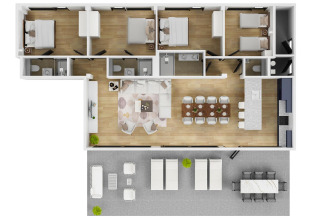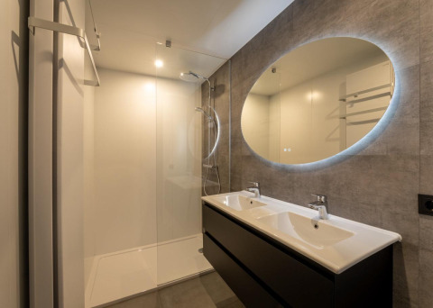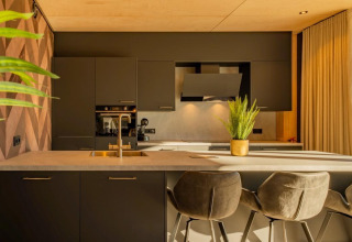 Med fire rummelige soveværelser, tre moderne badeværelser (hvoraf to er ensuite) og tre toiletter, byder denne villa på masser af privatliv og bekvemmelighed for større grupper. Den stilfuldt indrettede stue har en varm atmosfære med en læderbeklædt væg, aircondition, fladskærms-tv og gratis Wi-Fi. Det åbne køkken er fuldt udstyret med luksuriøse apparater, herunder en kombimikroovn, 4-pladers induktionskogeplade, køleskab med fryser, kogende vandhane, Dolce Gusto kaffemaskine og opvaskemaskine. Takket være de store vinduespartier er der dejligt lyst indendørs. Udendørs venter en stor, delvist overdækket terrasse – perfekt til lange aftener ved bordet eller et roligt øjeblik med udsigt til skoven.