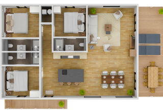 - 3 soveværelser, hver med eget badeværelse ensuite
