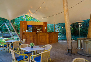 Teltet er udstyret med alt, hvad du behøver til et behageligt ophold. Indenfor finder du et badeværelse, et fuldt udstyret køkken, ideelt til lange aftener sammen ved bordet. Ved udendørsbaren opstår helt automatisk det særlige feriemoment: sammen skænke et glas, dele historier, grine og lade dagen stille og roligt gå over i aften. Ingen hast, ingen planer – kun hinanden og naturen omkring dig.