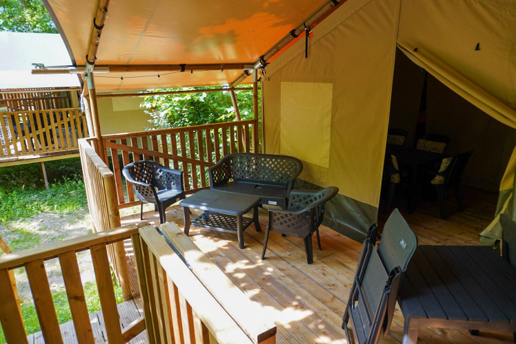 Dette unikke safaritelt er udstyret med alle bekvemmeligheder til den perfekte glampingferie! Med de trædetaljer og den optrullelige front, får du den ægte udendørs følelse af camping, med al hjemmets komfort. Teltet har en hyggelig veranda med markise, så du kan nyde at være udenfor. Safariteltet har et fuldt udstyret køkken med inventar og indeholder et fireblusset, sikkert gaskomfur, et køleskab, en kaffemaskine og en elkedel. Safariteltet har også sit eget toilet. Derudover er der to soveafdelinger i teltet. I den ene soveafdeling er der en dobbeltseng, og i den anden er der to enkeltsenge. Alle senge inkluderer dyner og puder.