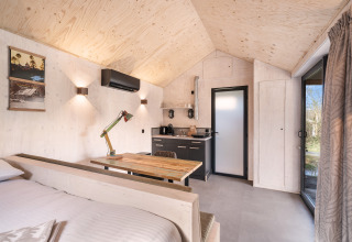 Oplev en autentisk barn, inspireret af den klassiske amerikanske lade og gemt blandt træerne ved skovkanten. Indenfor venter et hyggeligt, stilfuldt rum med en komfortabel dobbeltseng, siddeområde og et komplet køkken med kogeplade, køleskab, Dolce Gusto og elkedel. Det moderne badeværelse har en brusekabine, toilet og håndvask. Aircondition og elektrisk opvarmning sørger for et behageligt ophold året rundt, mens wifi er tilgængeligt for dem, der ønsker at forblive forbundet. Udenfor indbyder verandaen med terrassemøbler til afslapning i naturen, omgivet af ro og grønt. Røgfri, kæledyrsfri og perfekt som base for vandre- og cykelruter i området.