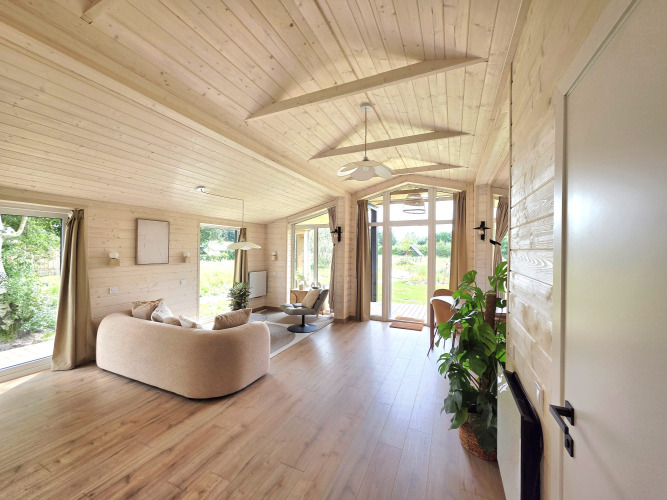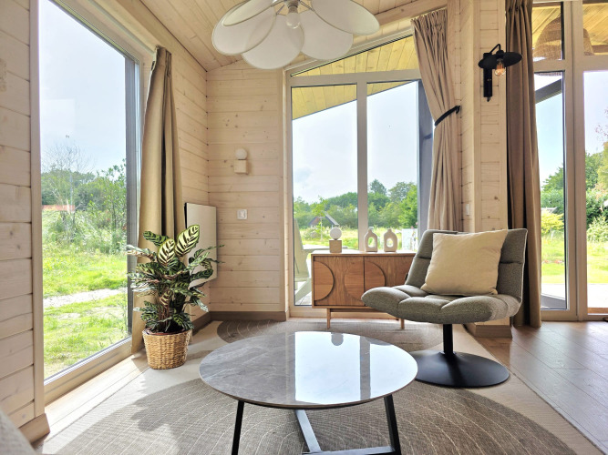 Slowlodge er egnet til 1 til 4 personer og er udstyret med alle bekvemmeligheder. Store vinduer bringer udelivet ind, mens naturlige materialer og bløde farver skaber en varm, beroligende atmosfære. I den hyggelige stue finder du et komfortabelt siddeområde og spiseplads med udsigt til det grønne. Det åbne køkken er fuldt udstyret, så du også her kan lave mad bevidst og simpelt. Der er to soveværelser: begge med to enkeltsenge. Ideelt for familier eller venner.
