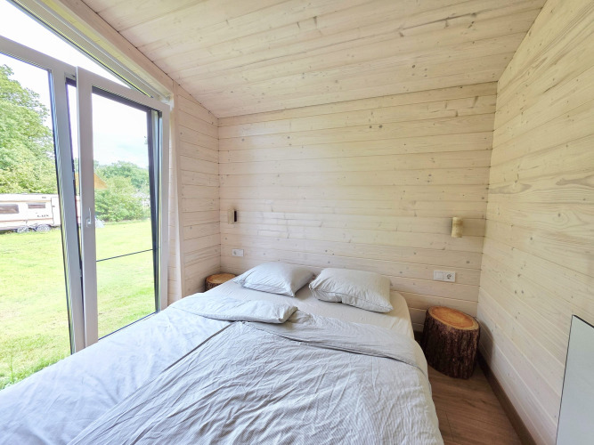 Udenfor venter din egen veranda, hvor du kan starte dagen med en kop te i morgensolen eller afslutte den ved bålet under en stjernehimmel. Rundt om hytten er der masser af plads, grønt og stilhed – kun fuglenes sang eller trækronernes susen minder dig om, hvor tæt på naturen du er her.