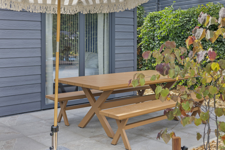 - Rummelig terrasse (delvist overdækket) med loungesæt
