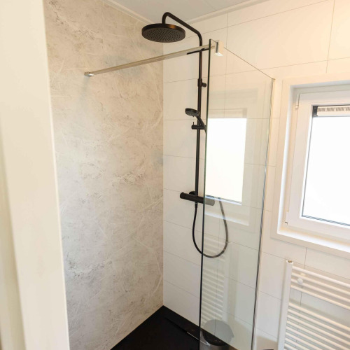 Det luksuriøse badeværelse er fuldt udstyret med en dejlig brusekabine og et vaskeskab med stort spejl. Der er også et lille Rituals-forkælelsessæt og et håndklædesæt (1 badehåndklæde + 1 håndklæde pr. person). Toilettet er i et separat rum ved siden af badeværelset.