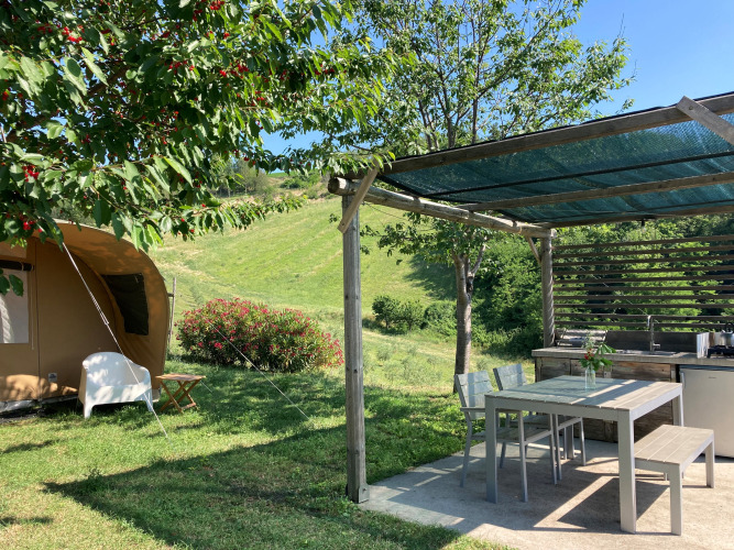 Luksus glampingtelte med udendørs køkkener er fordelt på rummelige pladser langs en olivenlund. Pladsen har en overdækket udendørs lounge, en saltvandsswimmingpool, sportsfaciliteter og spil for alle aldre. I nærheden ligger historiske byer som Moresco og Offida, store strande ved Pedaso og Sirolo og de smukke nationalparker Monte Sibilini og Conero, som er ideelle til vandring, cykling og kulturelle udflugter.