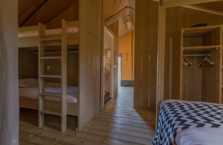 De stilfulde safaritelt kombinerer rigtig naturstemning med komforten fra en feriebolig. Begge varianter tilbyder et fuldt udstyret køkken, badeværelse med bruser og toilet, møbleret terrasse, gratis wifi og tv. Safaritelt L tilbyder 45 m² med to soveværelser, en dobbeltseng og to køjesenge – ideelt til 4-6 personer, med udsigt til de omkringliggende bjerge. Endnu mere plads finder du i Safaritelt XL med 55 m², tre soveværelser og plads til op til 8 personer. Kæledyr er ikke tilladt i nogen af boligerne.