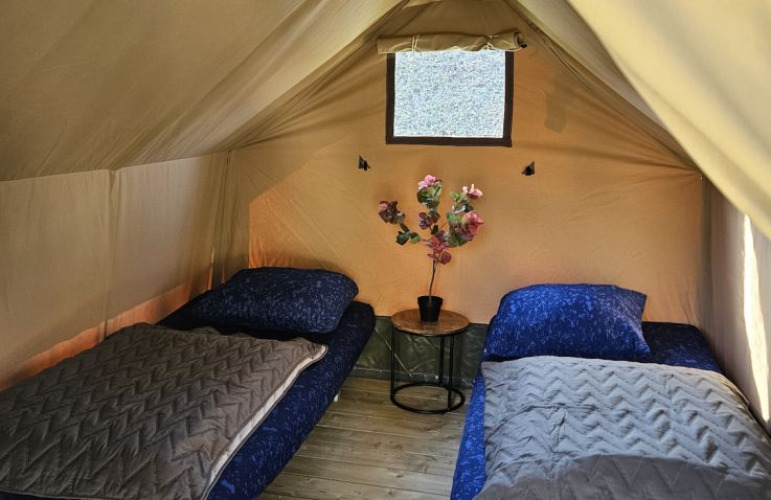 På Camping Neumühle venter to små, men charmerende safaritelte, som giver dig en unik naturoplevelse med en fantastisk udsigt. Teltene er udstyret med to enkeltsenge, et lille køleskab og en stikkontakt, så du har alt, hvad du skal bruge til et afslappende ophold. To stole og et bord inviterer dig til at nyde udsigten og sætte pris på roen i omgivelserne.