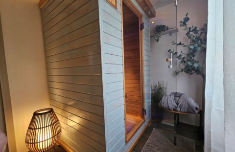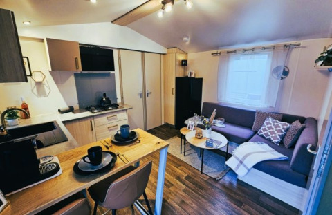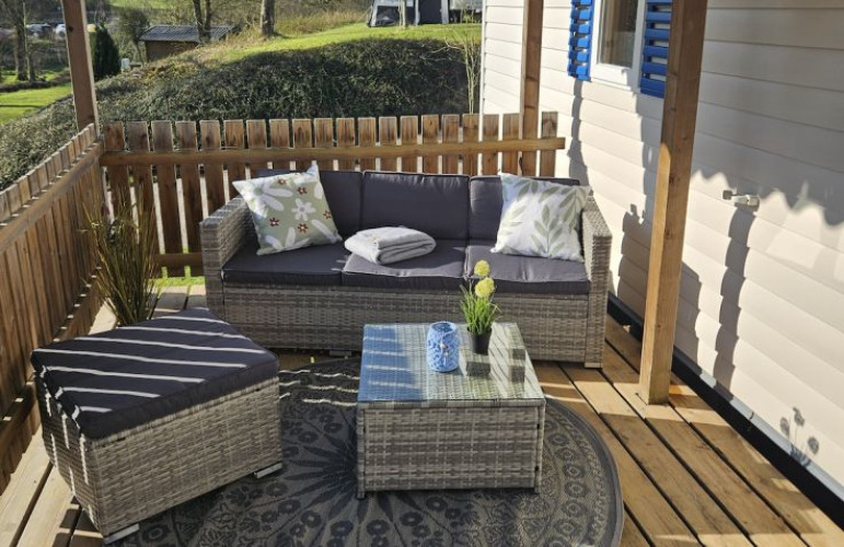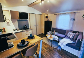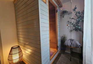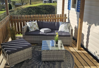Et særligt højdepunkt er det separate rum med infrarød sauna, som kan bookes på forespørgsel, men ikke er obligatorisk. Udenfor lader mobilhomet heller ikke noget tilbage at ønske: På den overdækkede terrasse med lounge kan du nyde freden og roen i omgivelserne. Jacuzzien, som også kan bestilles, tilbyder yderligere udendørs afslapning.