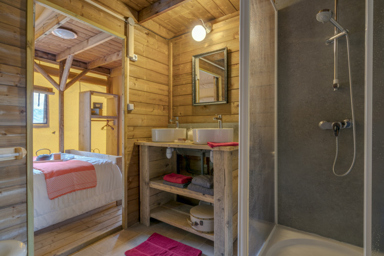 Dette luksuriøse safaritelte i Vendée er egnet til op til 8 personer og har flere etager. I stueetagen er der to soveværelser, begge med dobbeltseng. På mellemetagen står fire enkeltsenge. Benyt det fuldt udstyrede køkken, hyg jer sammen i stuen med tv, eller nyd et måltid i spiseområdet. Badeværelset er udstyret med bruser, håndvask og toilet. Oplev udsigten og den friske luft fra den møblerede terrasse og kig ud over søen eller dyreparken. For at gøre din glampingferie i Frankrig ekstra komfortabel, er dette safaritelte også udstyret med aircondition.