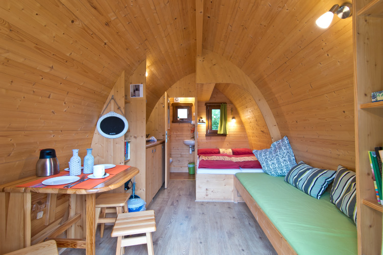 I disse étværelses boliger er der en dobbeltseng og, afhængigt af indretningen, en sovesofa eller en køjeseng til et eller to børn. Du finder også en opholds- eller soveafdeling med tilhørende siddegruppe, tv, tørrestativ og opvarmning. Toilettet med håndvask findes i et separat rum. I disse glampingboliger i Tyskland finder du et tekøkken med køleskab, vask, kogeplade, kaffemaskine, kedel samt kogegrej og service. Lodges og pods suppleres med en terrasse med havemøbler og et ekstra solsejl til lodgen. Prisen inkluderer ekstra omkostninger, sengetøj kan tilkøbes.