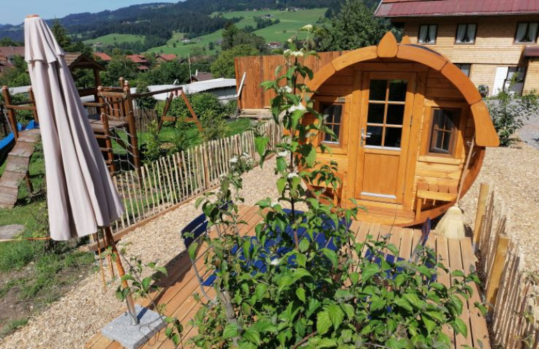 Den idylliske førsteklasses beliggenhed, lige ved en bjerggård med ægte Allgäu-køer og deres ikoniske klokkespil, gør Camping-Aachs sovetønder særligt attraktive. De byder på en fantastisk udsigt over Bregenzerwald op til Säntis. Beliggenheden og designet af disse trætønder er så overbevisende, at de endda blev tildelt CampingpladsAward i 2023!